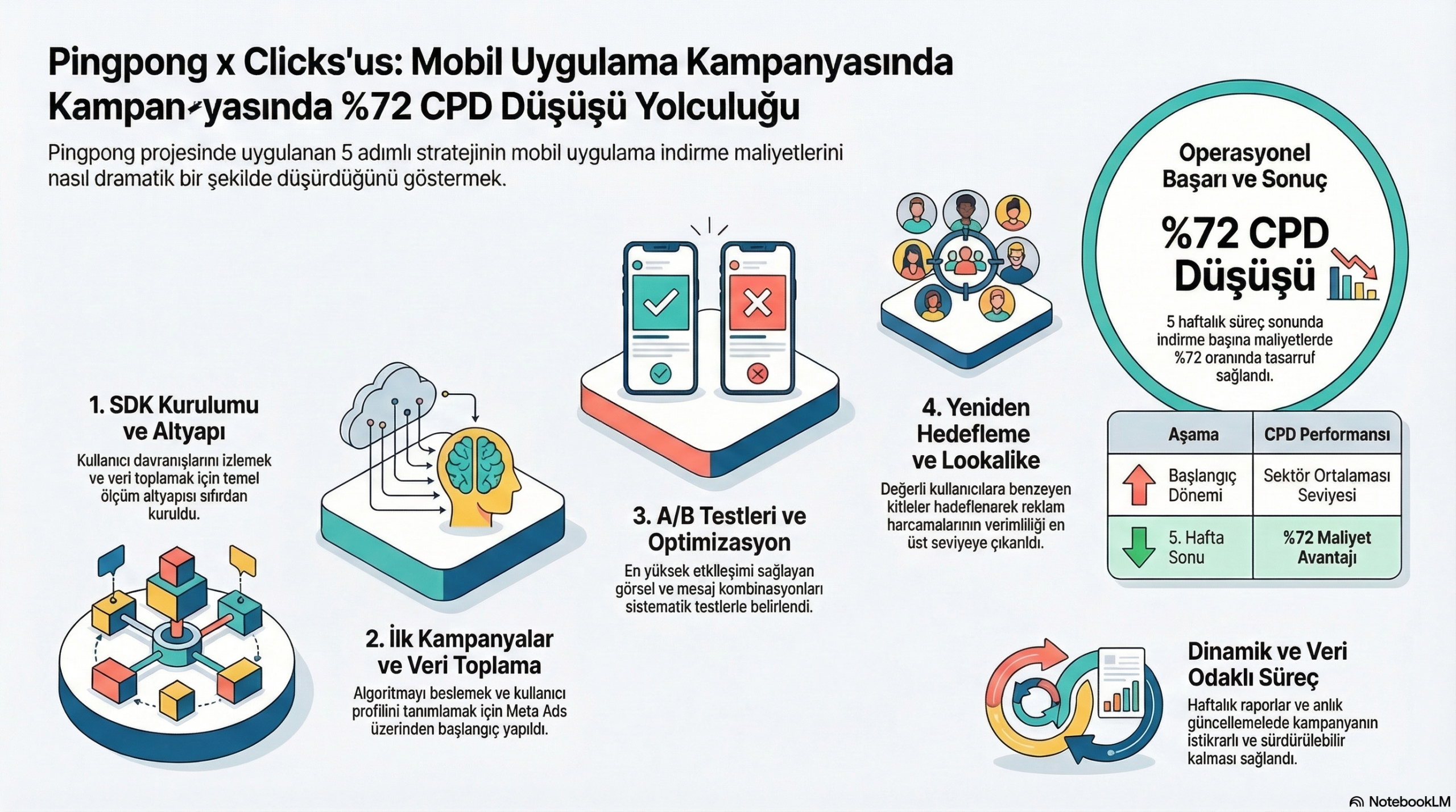 Mobil uygulama kampanyaları, markaların dijital dünyada kullanıcılarla doğrudan etkileşim kurabilmesi için en güçlü araçlardan biridir. Ancak bu potansiyeli gerçek sonuca dönüştürmek; doğru stratejinin, sürekli analizin ve etkili optimizasyon süreçlerinin birlikte çalışmasını gerektirir. Pazarlama dünyasında bir kampanyanın sıfırdan başlayıp başarıya ulaşma yolculuğu çoğu zaman zorlu ve çok katmanlıdır. Daha önce mobil uygulama kampanyası yapmamış olan Pingpong için başlattığımız bu özel projede, SDK kurulumunu tamamladık ve ilk kampanya sürecimizde CPD maliyetini %72 oranında düşürmeyi başardık.